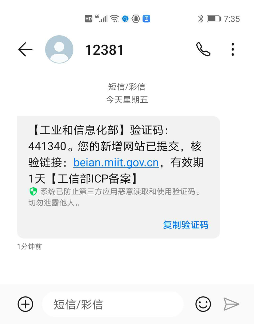 网站备案完成初审工作后(资料正确的情况下),备案接入商会将网站备案数据正式提交到工信部系统,之后网站负责人会收到由工信部系统发来的短信验证码与验证链接地址,验证码的有效时间为1天(24)小时。