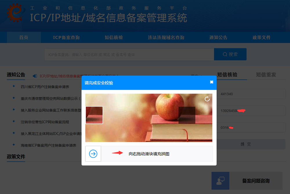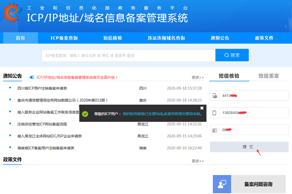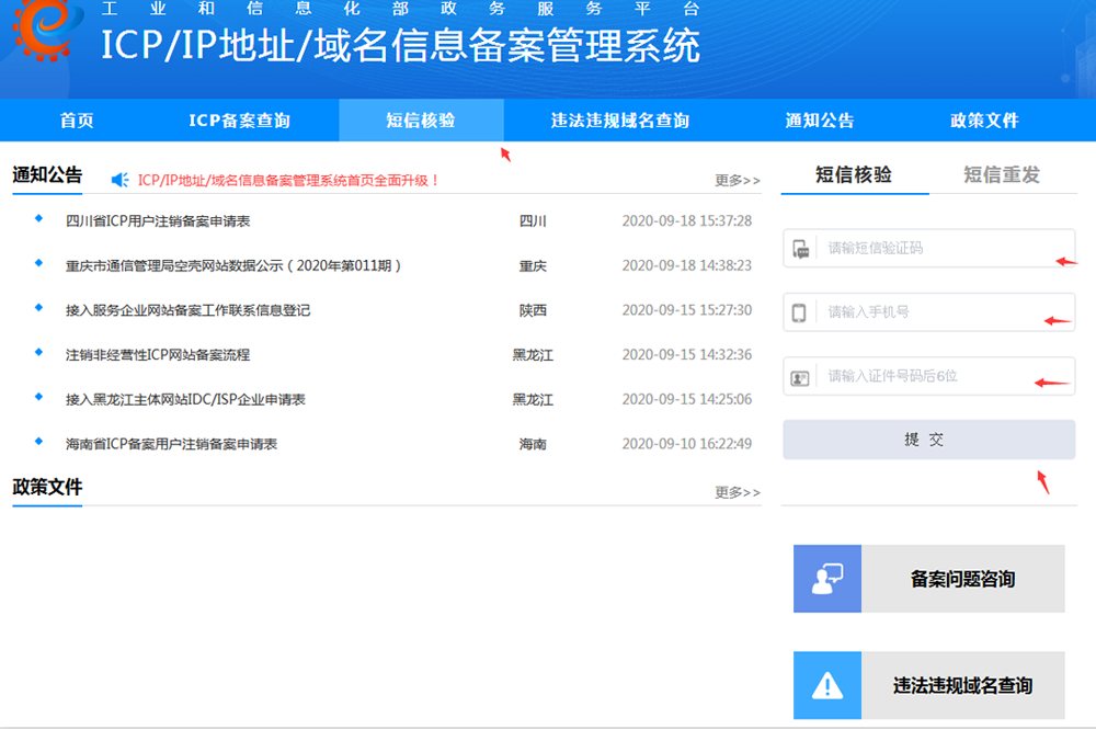 输入备案系统里面填的网站负责人手机号码(接收知信验证码的号)与网站负责人的身份证号后面6位数