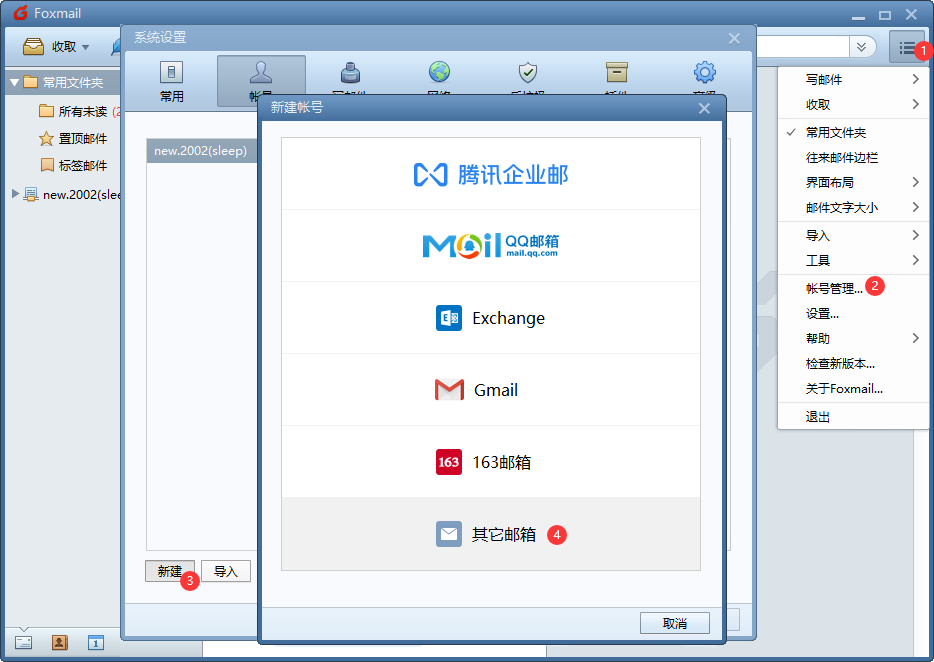 第一步:打开Foxmail,点击右上角菜单,选择【帐号管理】。点击【新建】,选择【其他邮箱】。
